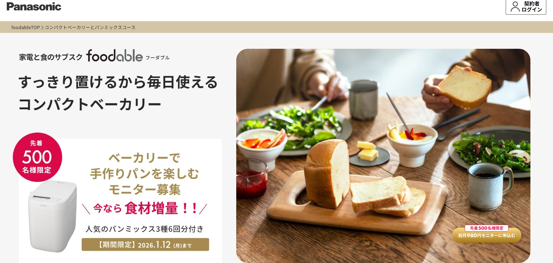 「foodable」は、コンパクトベーカリーと専用パンミックスを組み合わせて利用できるサブスクリプションサービスです。自宅にいながら、毎日焼き立てのパンを手軽に楽しめる設計で、料理経験が少ない人でも扱いやすく、定額制で続けやすい点が特徴です。ベーカリー本体のレンタルとミックス提供がセットになっているため、購入前の不安を持たずに新しい食体験を始められます。